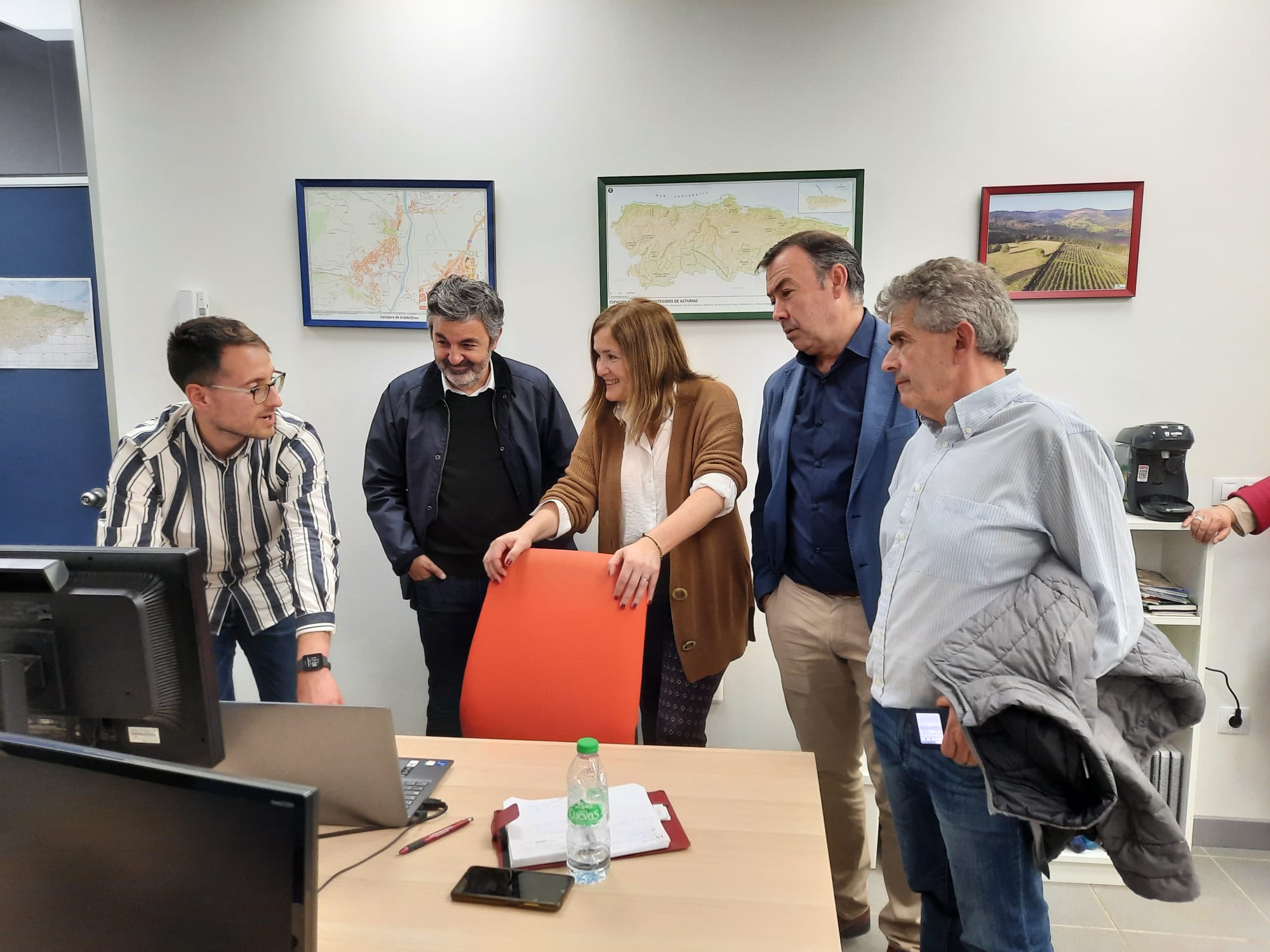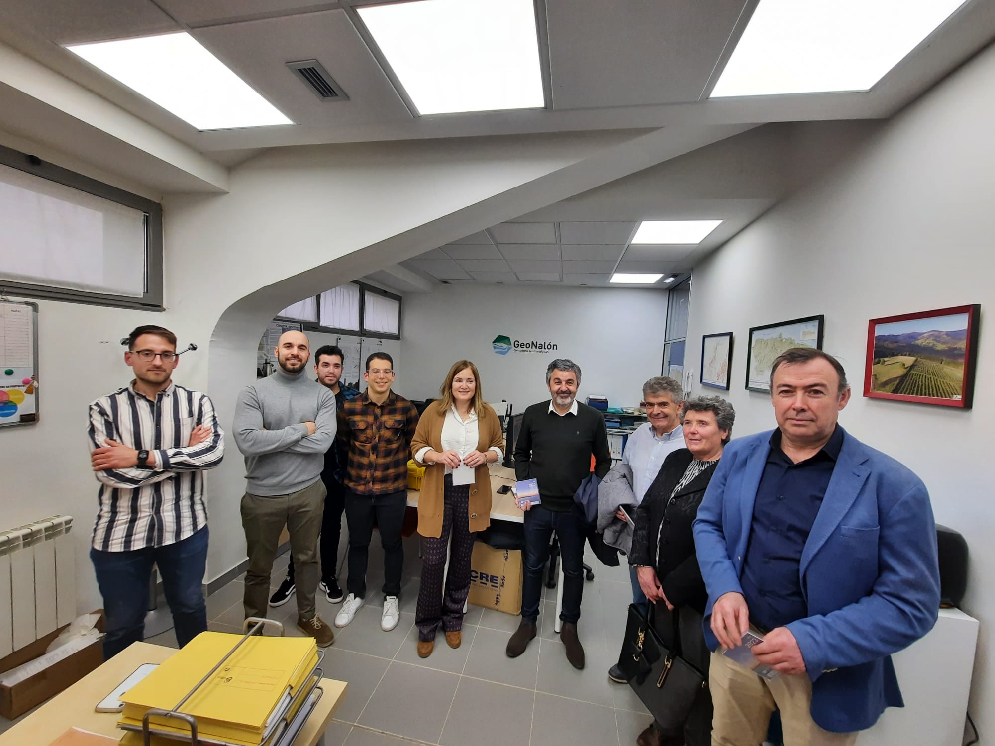 Posteriormente la delegación se desplazó hasta el polígono de La Cardosa, también en Grado, donde visitó la consultoría territorial y GIS GeoNalón, una sociedad cooperativa integrada por cuatro socios, todos ellos en torno a los 30 años. Se trata de una empresa innovadora de base tecnológica que lleva en funcionamiento desde 2017 que realiza trabajos de consultoría territorial para la realziación de trabajos relacionados con la ordenación del territorio y la digitalización de la información para su posterior uso. Es la única empresa especializada en este tipo de trabajo en Asturias, por lo que éste es su principal nicho de mercado, fundamentalmente ayuntamientos y entidades públicas, así como empresas locales.