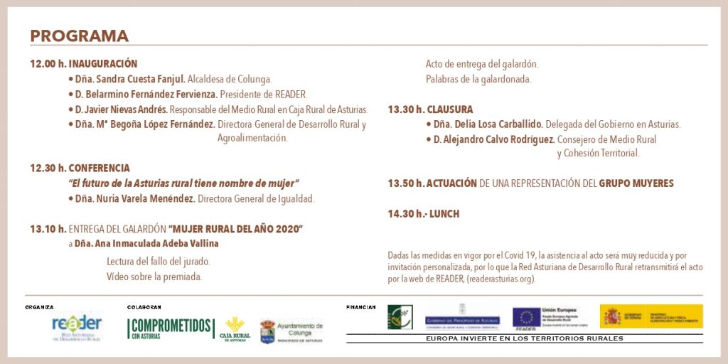 Esta tercera edición se ve afectada por las medidas en vigor por el COVID-19 y tendrá el aforo limitado por invitación personalizada. Por esta razón el acto será retransmitido en directo por la web de READER (www.readerasturias.org) y su canal de Facebook  https://www.facebook.com/reddedesarrolloruraldeasturias.
