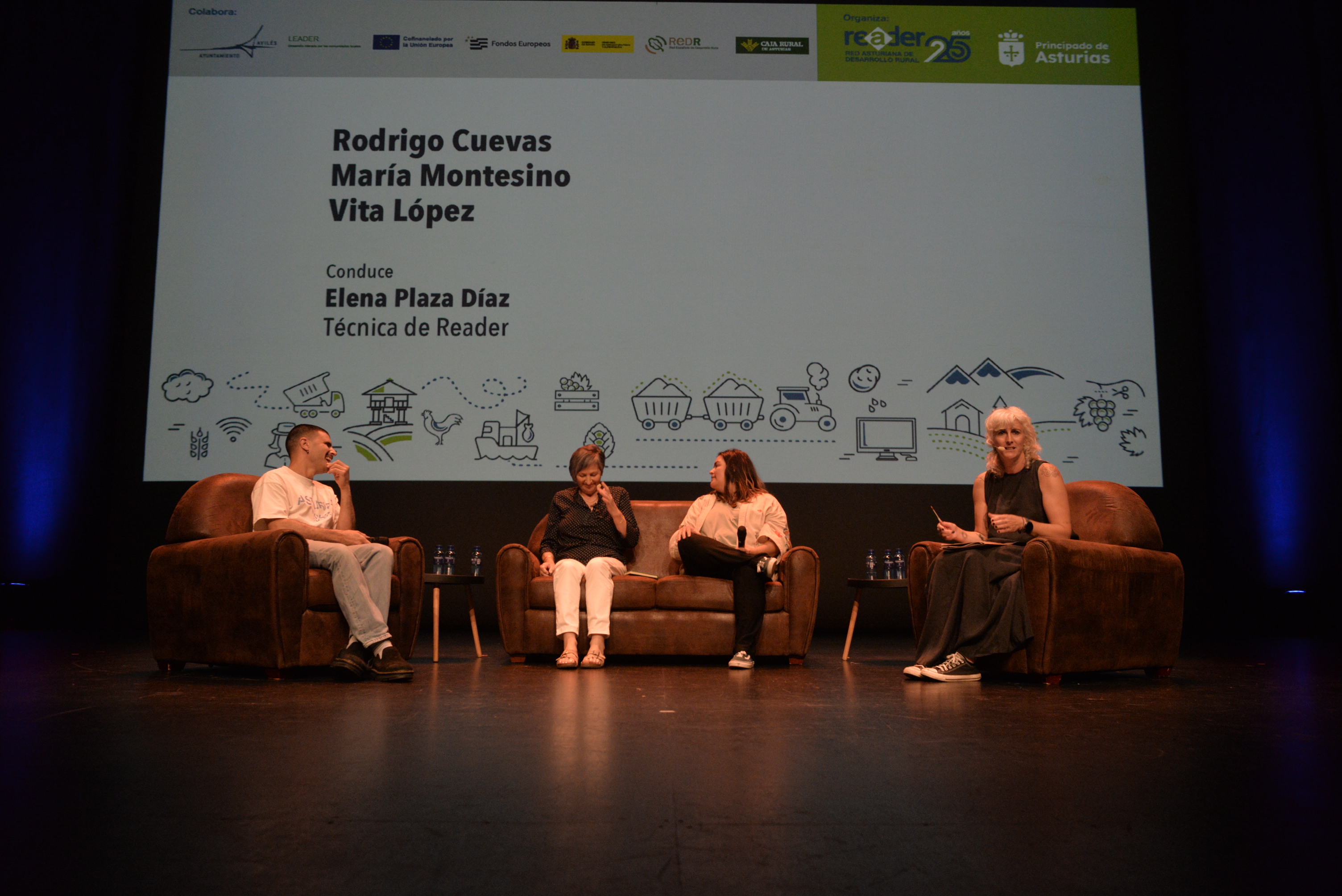Tras la pausa café se retomó el discurrir de la jornada con la conversación con alma rural protagoniza por el artista Rodrigo Cuevas, la socióloga y productora agroecológica María Montesino, y la poetisa Vita López. A lo largo de una hora se debatieron temas en torno a la cultura, la comunidad, el orgullo de ser rural, la vivienda o la gentrificación, además de la necesidad de cambiar el discurso, en un encuentro conducido por la técnica de Reader Elena Plaza Díaz.