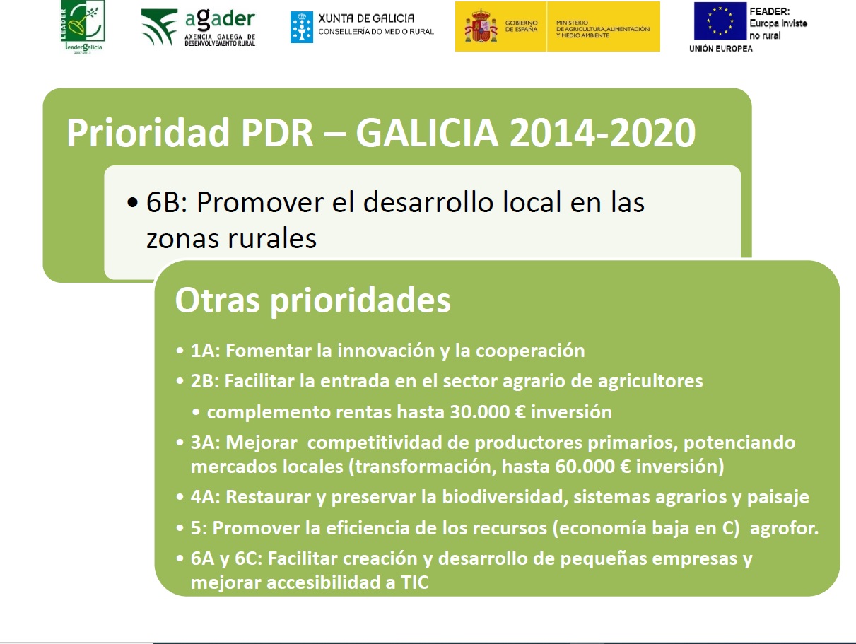 El gerente de Mariñas-Betanzos destacó entre las medidas de prioridad del PDR Galicia 2014-2020 la promoción del desarrollo local en las zonas urbanas, junto con otras medidas transversales, entre las que destacó facilitar la entrada en el sector agrario de agricultores, que inicialmente iba a quedar excluida pero que, trabajando con la Administración, se pudieron incorporar proyectos, como complemento de rentas a otras actividades.