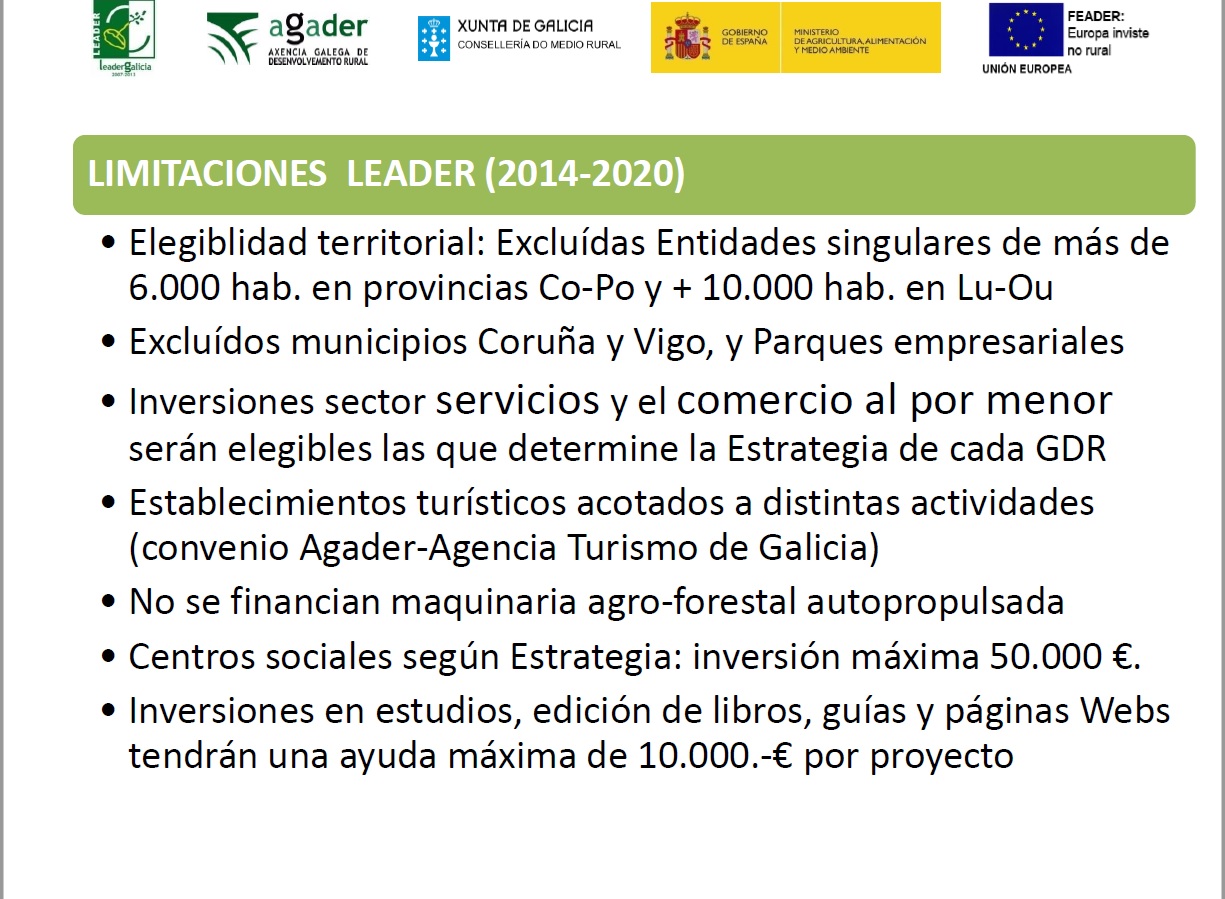 Recordó que están excluidos los municipios de Coruña y Vigo, los parques empresariales y las poblaciones de más de 50.000 habitantes además de entidades singulares de más de 6.000 habitantes en las provincias de Coruña y Pontevedra y de más de 10.000 en las de Lugo y Ourense. Asimismo se firmó un convenio con la Agencia de Turismo de Galicia destinado a aquellos proyectos de establecimientos turísticos acotados a distintas actividades.