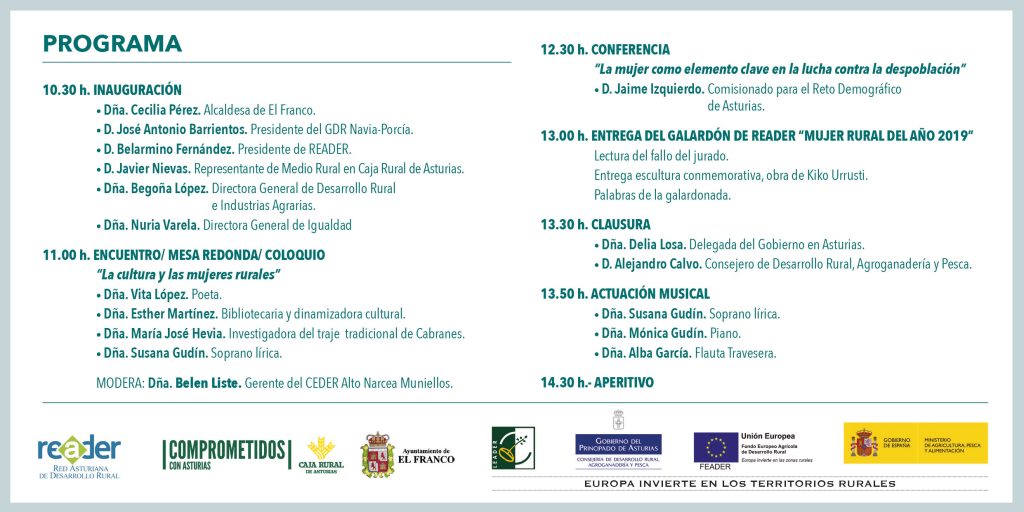 La jornada de actos comenzará a las 10.30 con la inauguración en la que participarán Cecilia Pérez, alcaldesa de El Franco, José Antonio Barrientos, presidente del Grupo de Desarrollo Rural Navia-Porcía, Belarmino Fernández, presidente de READER, Javier Nievas, representante de Medio Rural en Caja Rural de Asturias, Begoña López Fernández, directora general de Desarrollo Rural e Industrias Agrarias del Principado, y Nuria Varela, directora general de Igualdad.