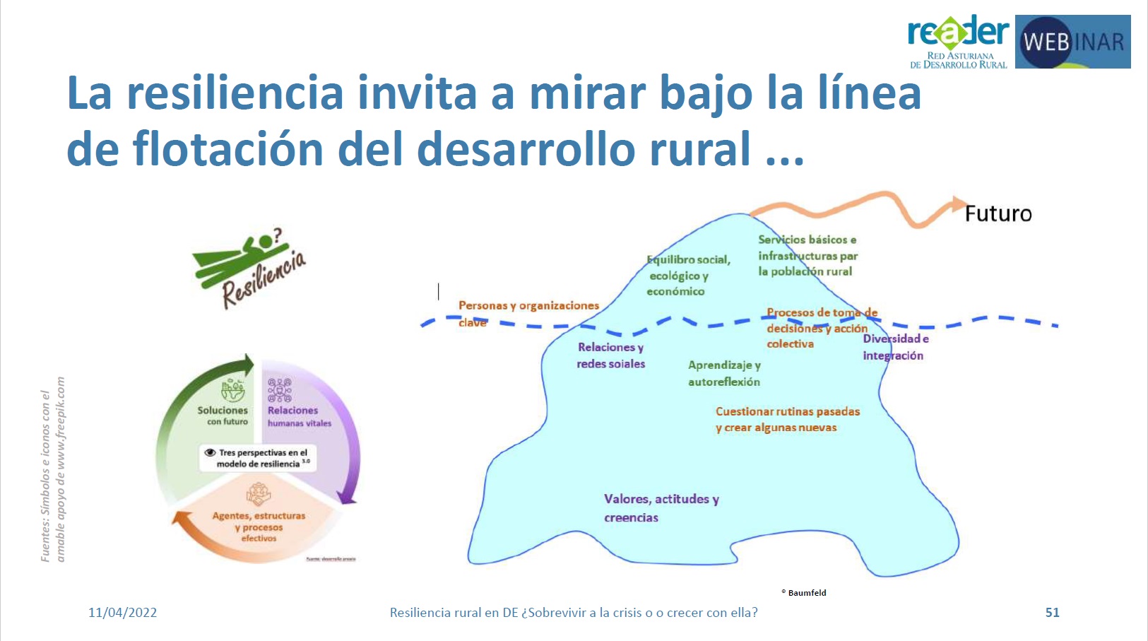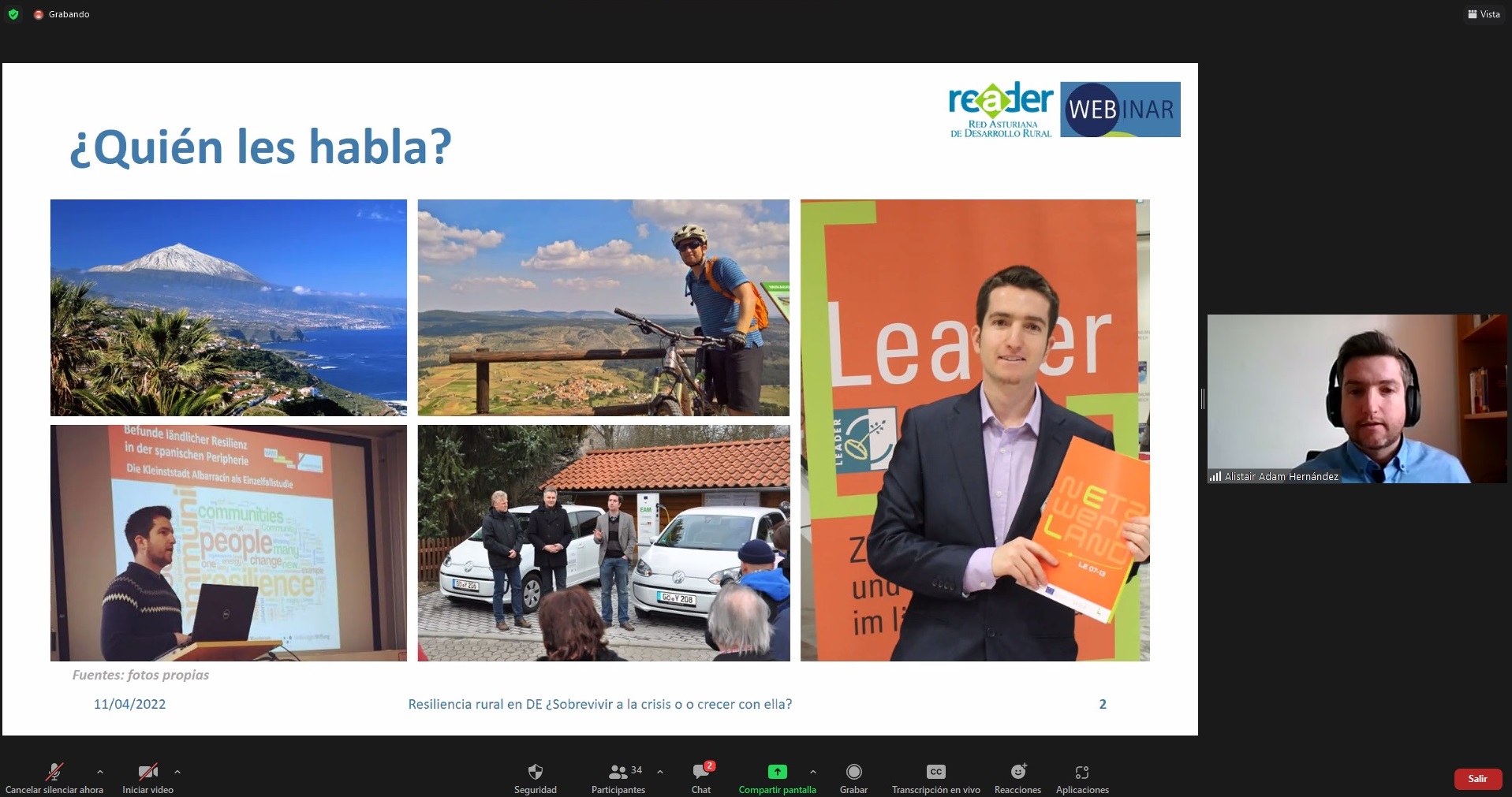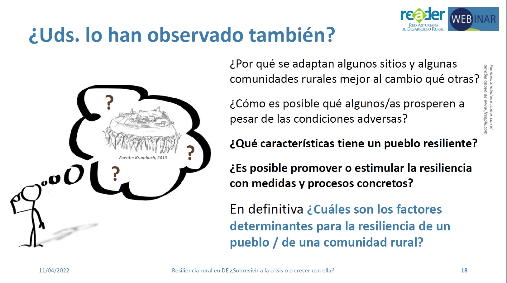 Tratar de discernir por qué unos pueblos se desarrollan de una manera más adaptativa frente a otros en teoría en un mismo contexto llevó a Alistair Adam Hernández, investigador de la Academia para el Desarrollo Territorial Leibniz (Hannover) a realizar su tesis doctoral sobre la resiliencia, un amplio concepto del que nos despejó algunas dudas y explicó cómo se está incorporando al desarrollo de las estrategias Leader en Alemania. Esta conceptualización y cómo aplicarla centró el webinar ‘Resiliencia rural en Alemania, ¿sobrevivir a la crisis o crecer con ella?’, organizado por la Red Asturiana de Desarrollo Rural.