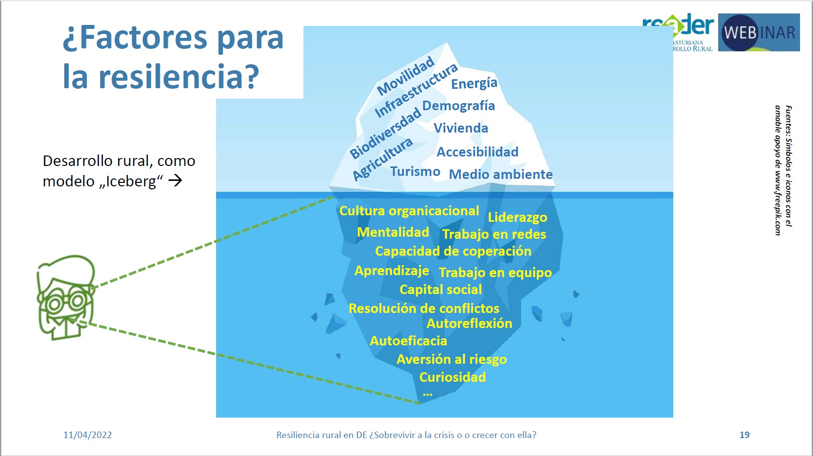 El investigador de la Academia para el Desarrollo Territorial Leibniz señaló algunos posibles factores para la resiliencia, algunos en la punta del iceberg, como se puede ver en la imagen, algunos en la parte visible, y otras en la no visible, más relacionada con el factor humano, algo que dijo que está “poco promovido”.