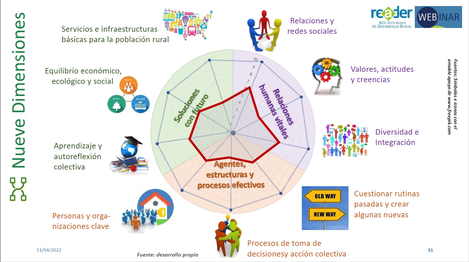 Estas perspectivas se subdividen en nueve dimensiones. Dentro de las Relaciones humanas vitales: relaciones y redes sociales; valores, actitudes y creencias; y diversidad e integración. En Agentes, estructuras y procesos efectivos: cuestionar rutinas pasadas y crear algunas nuevas; procesos de toma de decisiones y acción colectiva; y personas y organizaciones clave. Y en la tercera Soluciones con futuro: aprendizaje y autoreflexión colectiva; equilibrio económico, ecológico y social; y servicios e infraestructuras básicas para la población rural. En la presentación aportada al final de este texto se puede consultar el desarrollo de estas perspectivas.