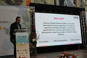 David Sanjuán presentó la organización internacional en la que colabora Erasmus Student Network (ESN), cuyo principal objetivo es promover actividades para el entendimiento cultural y el auto desarrollo personal bajo el principio de que los estudiantes ayudan a los estudiantes, estableciendo relaciones entre diferentes niveles de educación para dar a conocer los principios de la beca Erasmus.