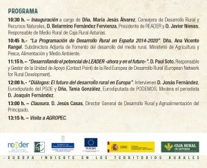 Inaugurada por la Consejera de Desarrollo Rural y Recursos Naturales, María Jesús Álvarez, el Presidente de READER, Belarmino Fernández Fervienza y el Responsable de Caja Rural Asturias, Javier Nievas y clausurada por el Director General de Desarrollo Rural, Jesús Casas, la Jornada se celebrará en la