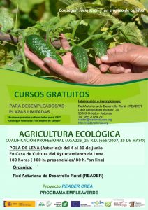 Agricultura Ecológica, en Pola de Lena y Actividades Auxiliares en Aprovechamientos Forestales, en Tineo, Estos son los títulos de los dos cursos que, a partir del 4 de junio, en Lena, y el día 1 de junio, en el concejo tinetense, respectivamente, se impartirán con cargo al proyecto READER CREA que la Red Asturiana de Desarrollo Rural ha puesto en marcha en colaboración con la Fundación Biodiversidad del Ministerio de Agricultura y Pesca, Alimentación y Medio Ambiente. Son cursos gratuitos dirigidos a desempleados/as que incluyen formación presencial y formación on line. Los/as alumnos/as obtendrán el Certificado de Profesionalidad.