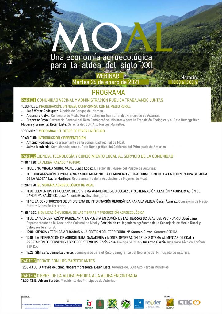 El futuro y el modelo de los pueblos y las aldeas rurales, como poblaciones del siglo XXI, será el tema principal del Wewbinar que lleva por título “Moal: una economía agroecológica para la aldea del siglo XXI” que tendrá lugar el próximo 26 de enero entre las 10 y las 13.15 horas. En este encuentro de expertos se quiere mostrar el MODELO DE LA ALDEA DEL FUTURO, ejemplificado en la aldea asturiana de MOAL, comunidad vecinal comprometida; que con el apoyo técnico, el compromiso y la colaboración de diversas instituciones, ha elaborado el paradigma de lo que habrá de ser la economía futura de los pueblos, con una propuesta práctica de cómo construirá su futuro a partir de sus SISTEMAS AGROECOLÓGICOS.